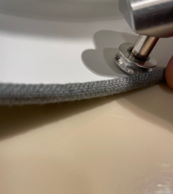 Tool for making lampshades, designed for accurate application of tape or fabric around and behind the lampshade frame. Suitable for wire thicknesses of 2.8–3.2 mm.