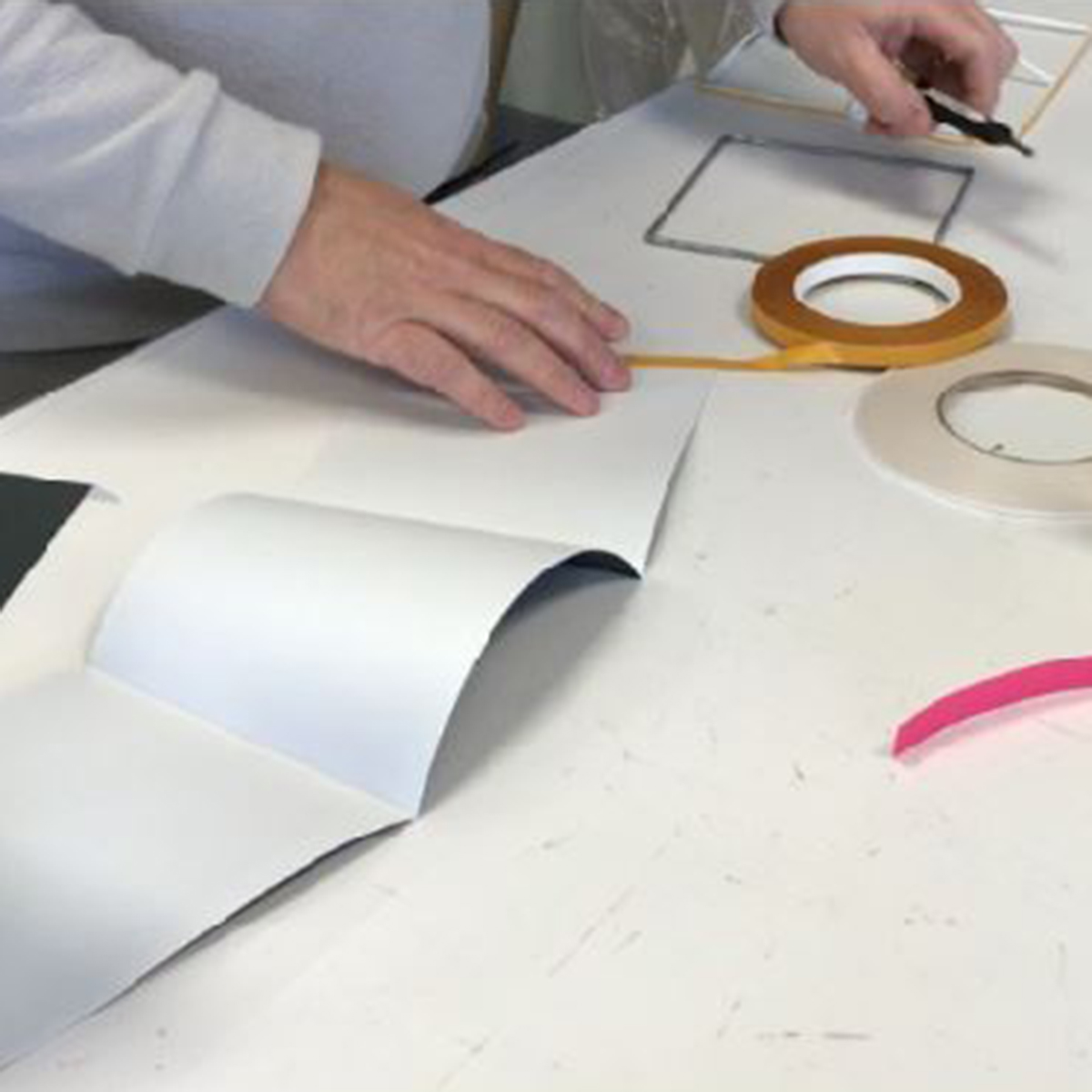 Wide double-sided adhesive tape, 18 mm. Non-transparent, slightly yellowish adhesive layer with acrylic glue. Suitable for closing the side seam of lampshades. Easy to tear by hand. Not recommended for use with transparent or light-colored fabrics.
